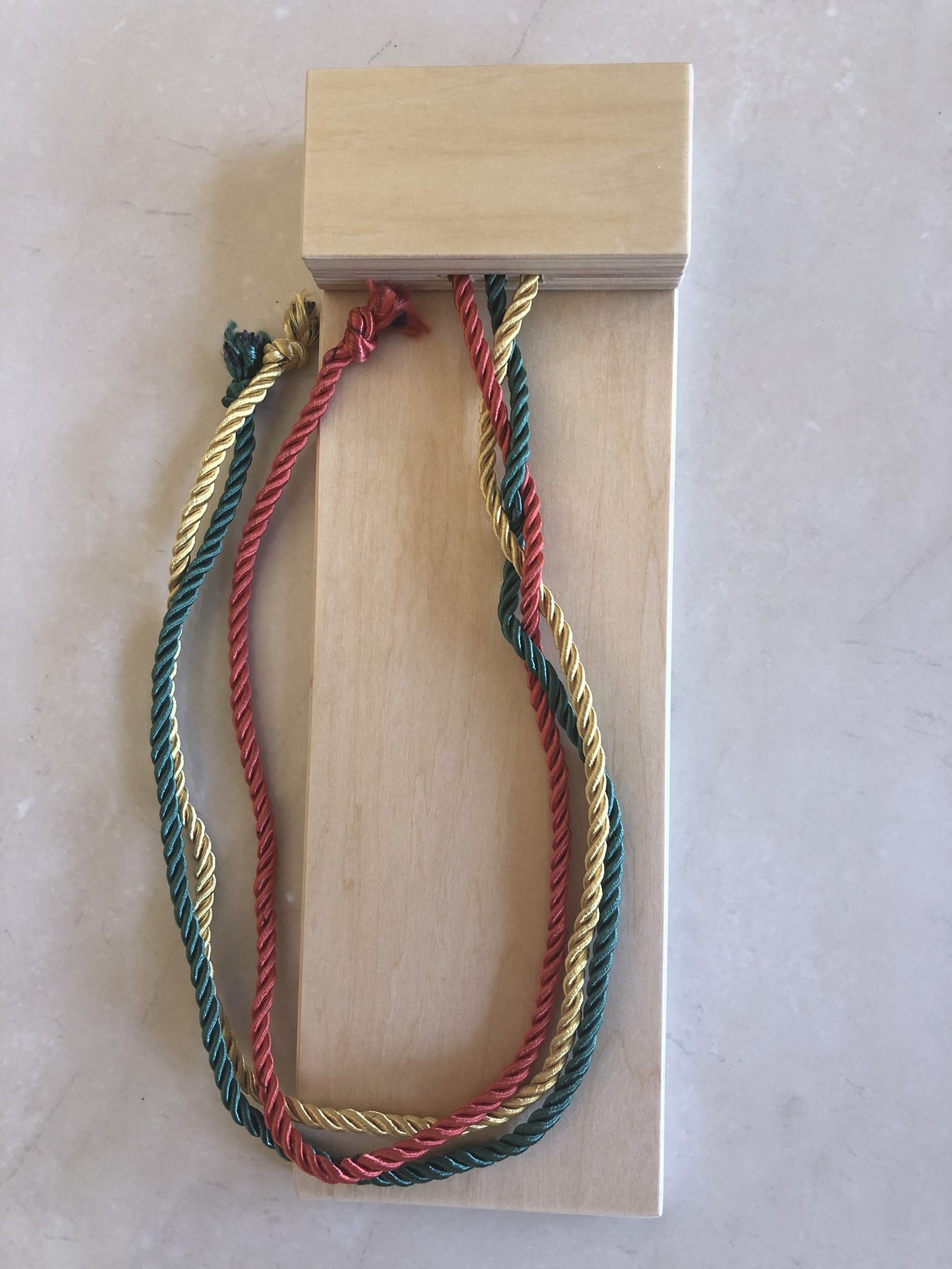 This wooden board is perfect for teaching children how to braid.  It makes them work on co-ordination of movement & fine motor skills.  It has a wooden base with three different colour cords of the same length attached to the top.
